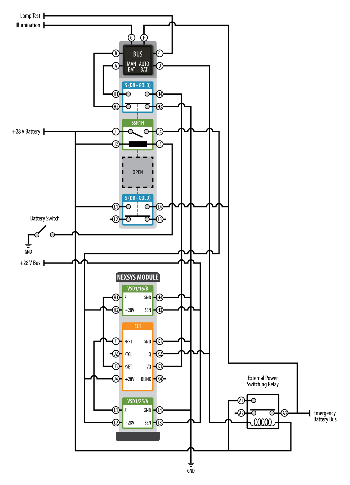 This application uses one (8-Pin) component and three (4-Pin) components. Two of the (4-Pin) components are Voltage Sensors (VSD1) that can be integrated into a single NEXSYS Module with the one (8-Pin) Electronic Latch (EL1). The remaining (4-Pin) component is a (NO) Solid State Relay 1 High 28 Volt (SSR1H) packaged in the VIVISUN Alternate Action BUS/BAT switch.