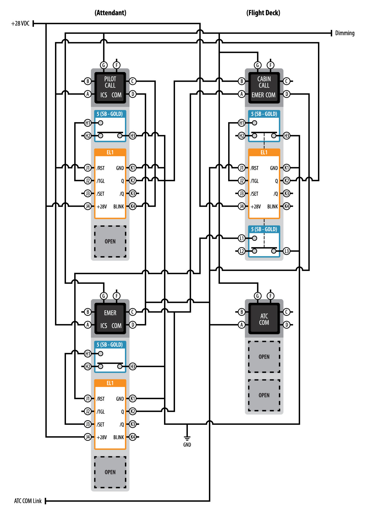 When the attendant depresses the momentary PILOT CALL switch the (H1) switch contact provides a ground to the /TGL input of the initial attendant EL1 activating the 1Hz BLINK output (K4) causing the PILOT CALL (C) legend to blink and the /TGL falling edge input to activate the Q output (K2) providing ground to the CABIN CALL legend on the flight deck illuminating the CABIN CALL legend. The pilot can then depress the CABIN CALL switch causing the (H1) contact of the flight deck switch to provide a ground to the /TGL input (J2) of the flight deck EL1 that causes the Q output (K2) of the flight deck EL1 to provide ground to the ICS legend (A) illuminating the legend and opening the intercom link between the flight deck and the cabin attendant station. Depressing the CABIN CALL switch on the flight deck also provides ground to the /RST input (J1) of the initial attendant station EL1 causing the Q output (K2) to go open turning off the CABIN CALL legend (A) and canceling the BLINK output (K4) to the PILOT CALL legend. The PILOT CALL EL1 remains in /RST (J1) so any attempt to cancel the active ICS from the cabin is ignored. The CABIN CALL EL1 however, toggles the (J2) input and the Q output (K2) turning the ICS on and off. If the ATC COM is activated by an external link, ground is provided illuminating each COM legend (D) and the /RST input (J1) is ground causing the Q output (K2) to go open turning off the ICS legend (A) in the cabin. If the attendant depresses the EMER switch and the ATC COM Link remains active at ground, the attendant can initiate an emergency call to the flight deck illuminating the EMER legend on the flight deck switch and the pilot can acknowledge the call but the ICS function cannot be activated since each EL1 remains in /RST (J1). When the ATC COM Link is canceled, the ground to the COM legend (D) is removed and the COM legend is extinguished. To reactivate the ICS link the pilot must once again select the CABIN CALL switch illuminating the ICS legend and opening the channel.