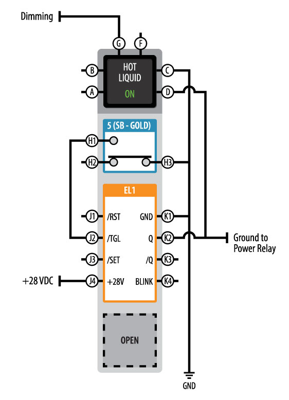 In this application, when the HOT LIQUID switch is depressed the (H1) switch contact provides ground to the /TGL input (J2) of the EL1 causing the Q output (K2) to transition from open to ground illuminating the “ON” legend and drives an external relay for the water heater. Pressing the switch again will turn the system off. When 28VDC power pin (J4) is cycled the EL1 resets transitioning the Q output to open (high impedance) turning the “ON” legend off and cancels the hot water relay.