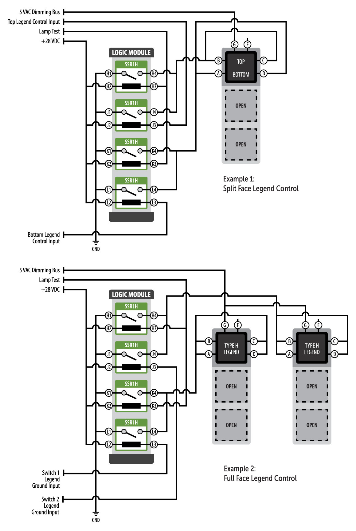 These circuit examples provide information on a Split Face top and bottom legend (Example 1)and a typical Full Face single illuminated legend (Example 2). The application may also have different packaging options depending upon the function of the illuminated switches. The NEXSYS Modules may be eliminated and the SSR1H components integrated into the switches using a VIVISUN High Capacity Body. The SSR1H components could also be packaged in the Lamp Test switches as the configuration allows. This circuit may also be adapted to other applications where power and signal isolation is required.