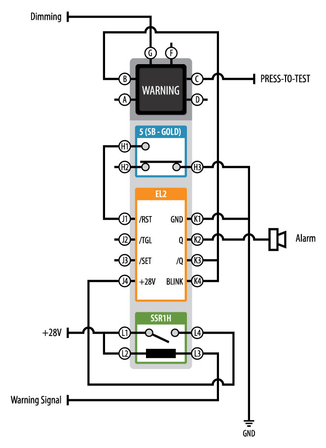 When a ground signal is received from an alarm sensor the SSR1H is activated providing 28VDC to power up the EL2. The default EL2 power up state is the Q output (K2) at ground which initiates the aural and cockpit alarms and sets the /Q output (K3) at high impedance activating the BLINK output (K4) and causes the WARNING control indicator to blink. Depressing the momentary switch activates the Reset function /RST (J2) of the EL2 causing the Q output (K2) to transition to high impedance canceling the aural alarm and the blink function. The /Q output transitions to ground converting the blinking “WARNING” legend to steady on. The “WARNING” indication will remain illuminated until the alarm signal ground is cleared or power to the system is removed.
