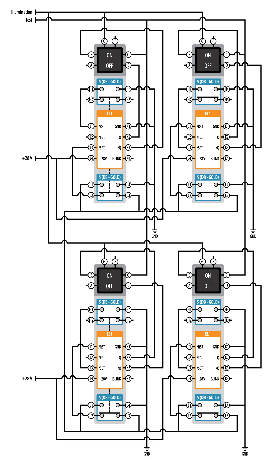 The power up state illuminates the initial switch (top left) in the ON mode by the /Q output (K3) to the (B) legend input. The remaining 3 switches are in the OFF mode with the /Q output (K3) connected to the (D) legend input illuminating the OFF legend. If any one of the 3 OFF switches is actuated, the ON legend of that switch illuminates from ground switched to the /SET input (J3) from the H1 switch contact and the Q output (K2) of the specific EL1. This selected switch is then canceled by the /RST input (J1) anytime a different switch is depressed. The initial (top left) switch is controlled in the same way but in an opposite state to the other 3 switches.