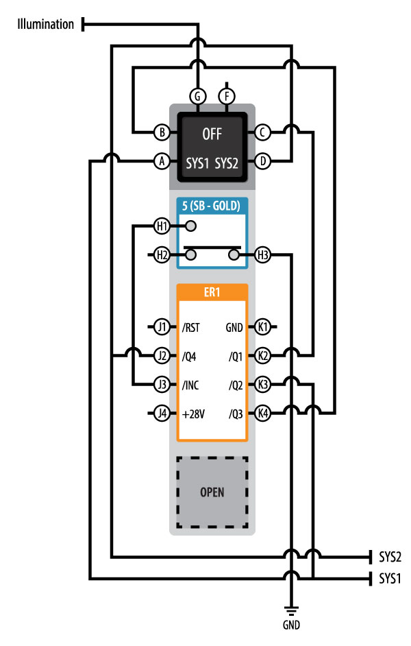 The switch powers up in the off state with the “OFF” (C) legend illuminated by the /Q1 output (K2) of the ER1. When the momentary switch is depressed and released the /Q2 output (K3)becomes active and provides ground illuminating the “SYS1” (A) legend and the SYS1 function. When the switch is actuated for the second time the /Q3 output (K4) is activated providing ground back to the “OFF” (B) legend. The third switch depression activates the /Q4 output (J2) illuminating the “SYS2” (D) legend and activating the SYS2 system. The fourth depression once again returns to the /Q1 off state illuminating the “OFF” legend.