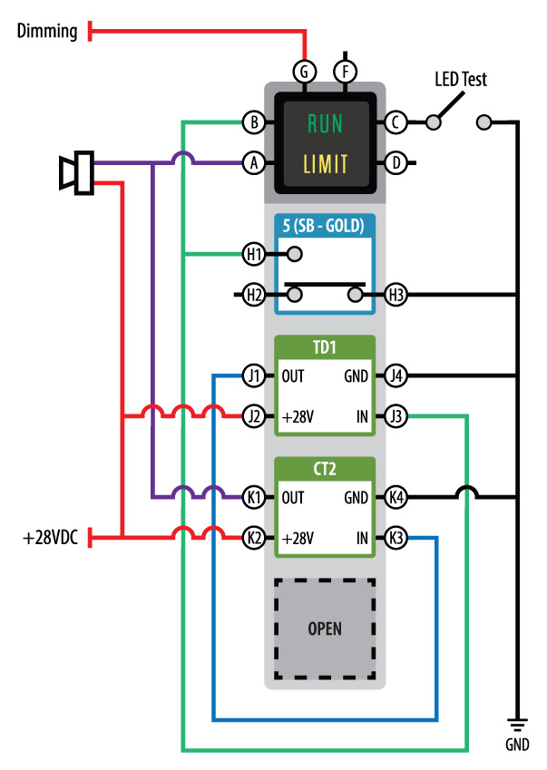 This example schematic demonstrates how the depicted NEXSYS Oscillator and Time Delay components, integrated inside of a VIVISUN high capacity switch body, can be combined to provide a time limit indicator with optional horn. When the switch is pressed it provides a latched ground to the input (IN) of the Time Delay which initiates the timer. When the specified time limit is reached, the Time Delay triggers the Oscillator to begin flashing the “LIMIT” indicator and sounding the horn at the specified frequency rate. This state will continue until the switch is depressed, which removes the latched ground from the Time Delay component and resets the circuit.