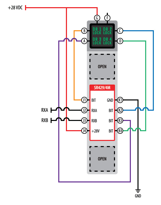 This application employs the SR429/4M to provide the status of four independent doors using ARINC data. A single ARINC data label may include the status (i.e. Locked = 0, Unlocked = 1) of four different doors on four separate bits within the label. This indicator can take this data and provide illumination to each cap quadrant when the respective door is in the locked condition. Furthermore, each of the open bays inside the VIVISUN indicator can further hold a Solid State Relay, Time Delay, Square Wave Oscillator, or several other 4 pin NEXSYS components if additional AND/OR gate logic is needed such as only illuminating the door lock indication if WOW (weight-on-wheels) signal is present.