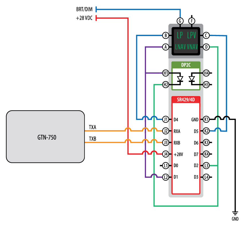 The SR429/4D receives ARINC 429 data via inputs RXA and RXB (J2 & J3) which are connected to the transponder TXA and TXB outputs. The SR429/4D is configured to read and decode ARINC 429 label 261, bits 17, 18 and 19. Based on the data, the SR429/4D will output discrete low (ground) signals corresponding to the level of service. Output D1 (L2) corresponds to LNAV (A), D2 (L3) corresponds to LNAV (A) and VNAV (D), D4 (J1) corresponds to LP (B), and D5 (K2) corresponds to LPV (C).