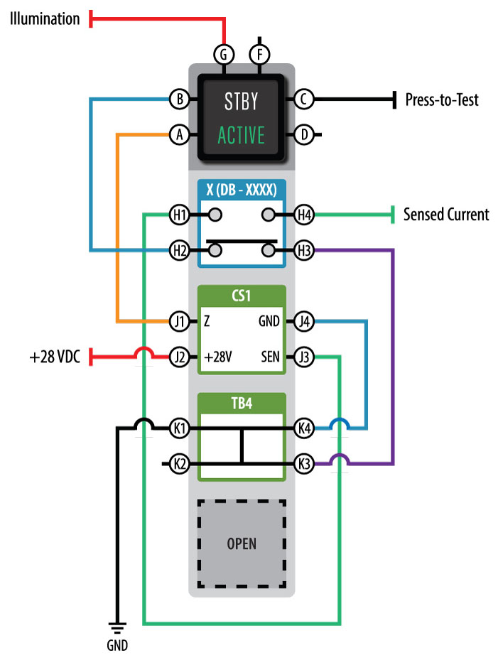 In its relaxed state, the “STBY” legend of the LED indicator is illuminated since the SPDT-DB switch is providing a path to ground through the normally-closed (NC) position of the switch contact. When the pushbutton switch cap is pressed, the SPDT-DB switch is actuated and latches in the normally-open (NO) position. This provides a path to the sense input of the NEXSYS® Current Sensor component. The "ACTIVE" legend remains Not Energized until the sense Input of the current sensor detects current above the specified set point. When this occurs, the Z output sources a Ground to Energize the "ACTIVE" legend, indicating that the specified current set point is reached.
