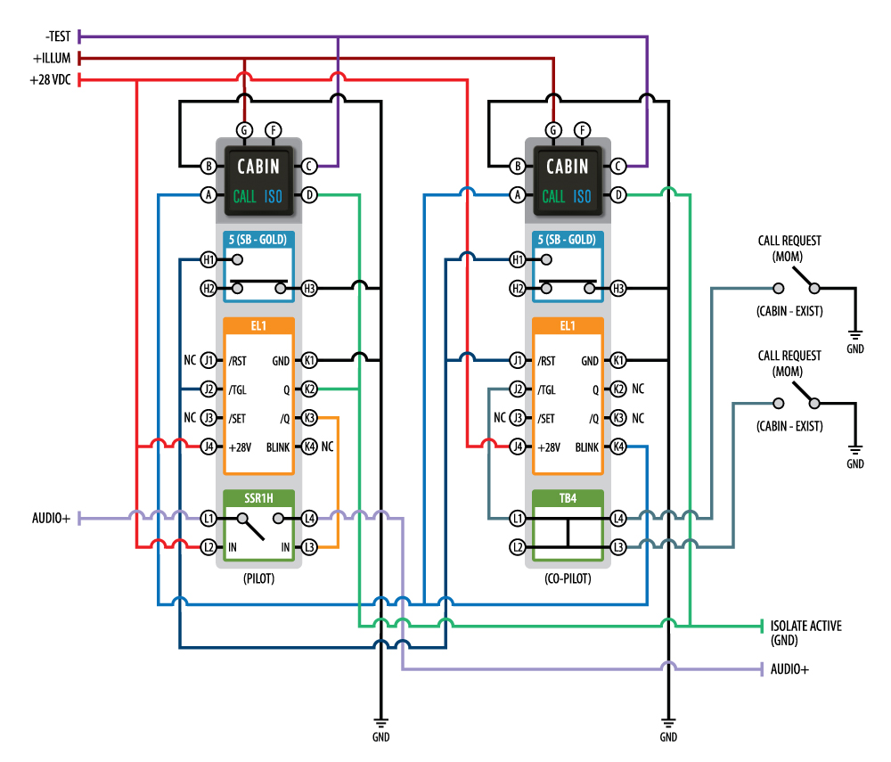 The design uses two switches that include VIVISUN High Capacity Bodies which each house momentary switch poles and NEXSYS Electronic Latches (EL1). NEXSYS Solid State Relay (SSR1H) and Terminal Block (TB4) components are utilized as well. The EL1s control the individual CALL and ISO states, while the SSR1H is used to interrupt the audio line when in the ISO state. The TB4 busses together the call request signals from the existing cabin momentary switches.