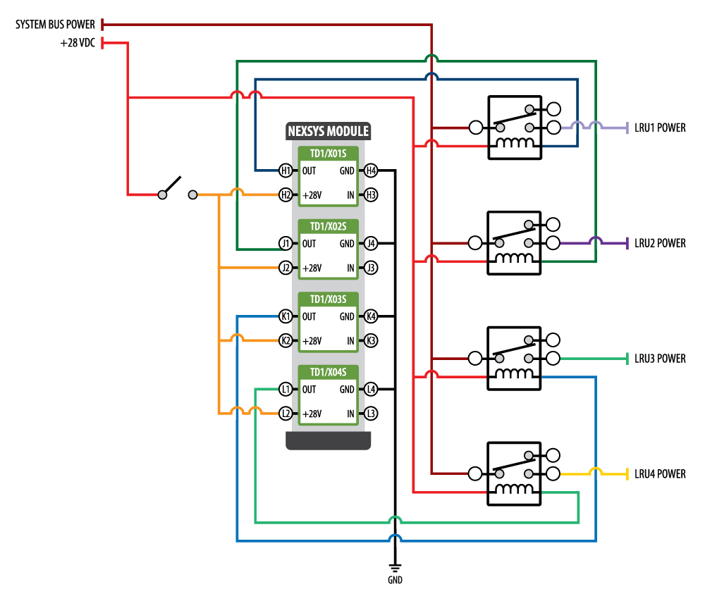 This application diagram depicts a power distribution control system with a staggered LRU startup using incremental time delay components. This design provides a custom sequential “soft” startup pattern such that certain units are powered up before others and serves the dual purpose of protecting power supplies from transient spikes associated with multiple units being powered up at the same exact time.