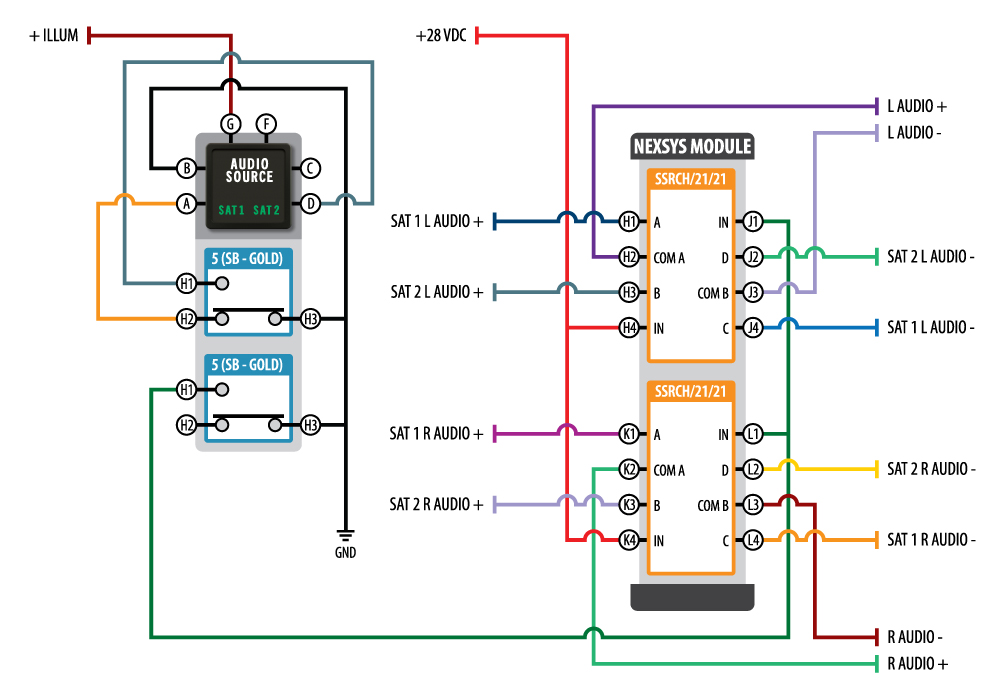 The design uses a single annunciator that has a VIVISUN Compact Body which houses two alternate action switch poles, and a standalone NEXSYS module which houses two NEXSYS Combination Solid State Relay (SSRC) components. The SSRCs are both configured as 28 VDC (H) dual common components with each common connected to a normally closed (2) and normally open (1) contact (SSRCH/21/21). The alternate action switches control both the indicated state and SSRCs. The SSRCs control the left (L) and right (R) audio signals by switching based on the selected source.