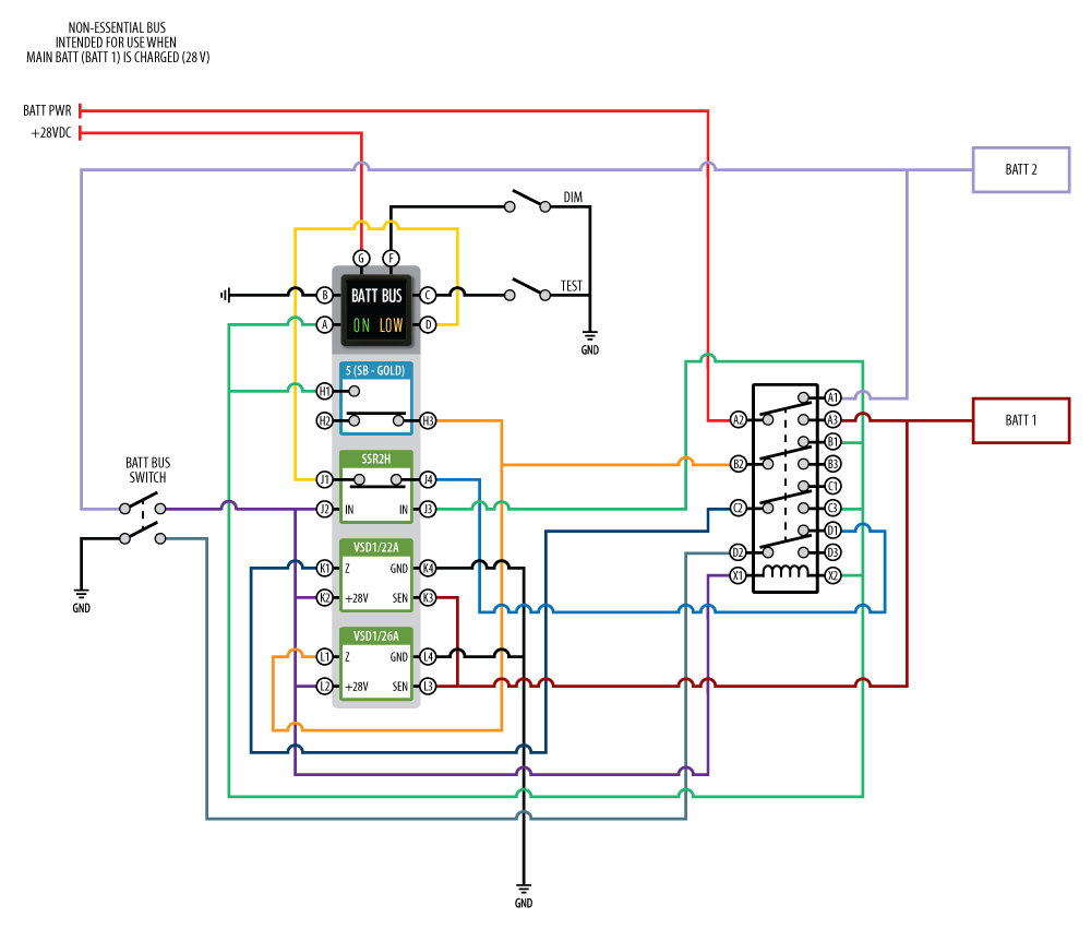 In the schematic, when the Battery Bus switch is activated, the Voltage Sensors begin to sense the Battery 1 voltage level. If the sense level is at full charge, Battery 1 is available for use. Otherwise, the “LOW” legend is energized indicating Battery 1 requires charge prior to use and Battery 2 is active. Upon full charge of Battery 1, the alternate action switch may be actuated. Upon actuation, the relay coil is energized illuminating the “ON” legend, confirming Battery 1 power is available. The Voltage Sensor setpoints are specified at 22VDC and 26VDC and a LOW indication results from Battery 1 dropping below 22VDC with the relay conducting to the (NC) Solid State Relay SSR2H and illuminating the LOW annunciation. On LOW voltage, Battery 2 remains active and Battery 1 is on charge until it reaches 26VDC and switchover returns Battery 1 to active mode illuminating the ON legend.
