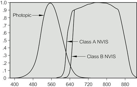 There are two NVIS response curves. The Class A curve uses a 625 nm minus blue filter which does not allow any red cockpit lighting. The Class B curve uses a 665 nm minus blue filter which allows the use of properly designed NVIS red lighting. Figure 4.1.0-A shows the Class A and Class B relative response curves as compared to the photopic relative response curve.