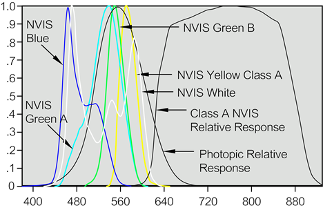 Figure 4.1.0-B shows the normalized spectral radiance curves for the Type I Class A colors of NVIS Blue, NVIS Green A, NVIS Green B, NVIS White and NVIS Yellow Class A. Also shown are the relative photopic response and the relative spectral response of the Class A NVIS. These are the only colors that are allowed in a Class A cockpit.