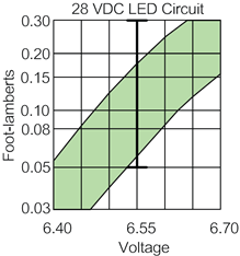 The Type S NVIS Blue, NVIS Green A, NVIS Green B, NVIS White and NVIS Yellow colors can be dimmed to 0.1 footlamberts as required by MIL-L 85762A and MIL-STD 411F for NVIS compatible military aircrew stations. The average display luminance is 0.05 to 0.3 footlamberts at 6.55 VDC for the 28 VDC LED circuits as measured at 23° C.