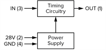 Delay: 28V (PIN 2), unit power-up is the trigger event that initiates the timer to start. OUT (PIN 1) remains at the Delay level until the specified timing has elapsed. The delay timer will reset if the trigger event is reversed, and OUT (PIN 1) will return to the Off condition.