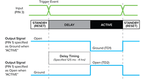 Active: OUT (PIN 1), specified as Low (Ground) or High-Z (Open), is Active when the specified timing has elapsed. The Active state will reset if the trigger event is reversed, and OUT (PIN 1) will return to the Standby (Reset) level.