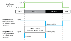 D Configuration Code*: IN (PIN 3) transitions from Low (Ground) or High-Z (Open) in Standby (Reset) to +28 VDC in Delay/Active.
