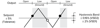 3. The VSD1 Nominal Rising Voltage setpoint tolerance of SENSE (PIN 3) is +/- 5%. Falling Voltage Hysteresis -3% Max (-2% Typical), measured from the setpoint after the inclusion of the Rising Voltage setpoint. The VSD2 setpoint tolerance of SENSE (PIN 3) is +/- 5%. The VSD2 has a hysteresis band (+/- 0.16%) that will prevent a state change until the sensed voltage exceeds hysteresis. Tolerance at EMC and Environmental extremes is +/- 10%.
