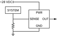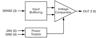 The NEXSYS Voltage Sensor (VSD1, VSD2) is a Series A (4 Pin) solid-state, low-side direct current (DC) voltage sensor, developed to enhance avionics design flexibility by offering undervoltage and overvoltage detection. The Voltage Sensor compares DC voltage in a linear relationship between the specified setpoint and the voltage that is being monitored by the SENSE input. The fast-response output provides a discrete signal that transitions from High-Z (Open) to Low (Ground) when the input detects voltage that is above or below the specified setpoint, see Figure 2.5.1.0-A.