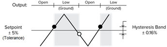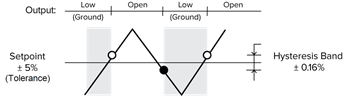 The NEXSYS Current Sensor features an extensive range of setpoints to provide an Active Low (Ground) output when the specified undercurrent or overcurrent condition is detected, as detailed below. The Current Sensor can also be configured to perform wide hysteresis.