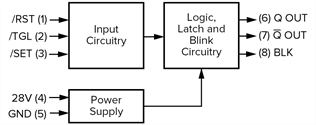 The NEXSYS Electronic Latch is available in two configurations for custom solid-state switching control. The device powers-up in a specified, known state. Upon power-up, High to Low ()signal transitions to the /SET, /TGL, and /RST input functions to control the Q, Q and BLK outputs.