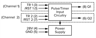 The NEXSYS Pulse/Timer offers numerous configurations for custom, solid-state edge-detection and pulsed-output control. The device powers-up in a specified, known state. After power-up, the TR 1 and TR 2 inputs detect signal transitions to control the Q1 and Q2 outputs.